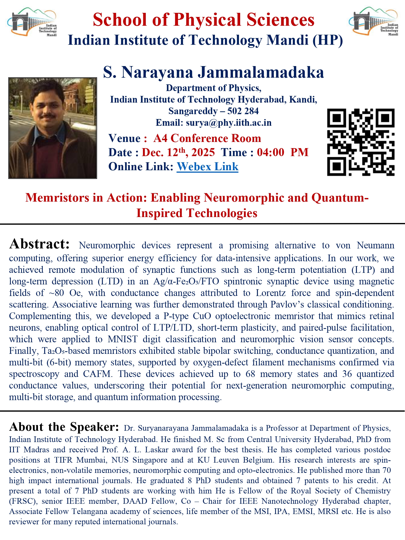 Dr. Suryanarayana Jammalamadaka is a Professor at Department of Physics, Indian Institute of Technology Hyderabad. He finished M. Sc from Central University Hyderabad, PhD from IIT Madras and received Prof. A. L. Laskar award for the best thesis. He has completed various postdoc positions at TIFR Mumbai, NUS Singapore and at KU Leuven Belgium. His research interests are spinelectronics, non-volatile memories, neuromorphic computing and opto-electronics. He published more than 70 high impact international journals. He graduated 8 PhD students and obtained 7 patents to his credit. At present a total of 7 PhD students are working with him He is Fellow of the Royal Society of Chemistry (FRSC), senior IEEE member, DAAD Fellow, Co – Chair for IEEE Nanotechnology Hyderabad chapter, Associate Fellow Telangana academy of sciences, life member of the MSI, IPA, EMSI, MRSI etc. He is also reviewer for many reputed international journals.